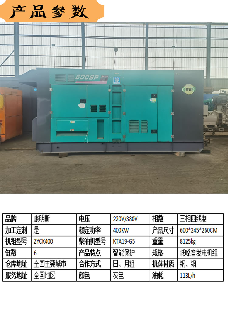 我公司为客户提供有多种型号的发电机组出租,有临时或者长期用电需求请与我公司联系。有些客户第一次接触发电机组,对该产品没有大致了解,在这里我们以400KW发电机组为例分享一些关于我们提供出租的发电机组参数,让客户对机组有个大概了解。