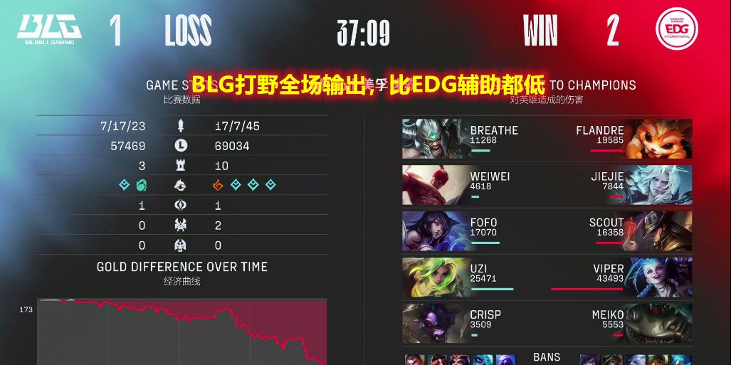 BLG战队打野Weiwei在这场比赛中全场梦游,除了抓住机会控下了三条小龙,啥都没干!全场比赛只打出了4618点伤害,比Meiko的塔姆还低,堪称BLG战队输掉本场比赛的罪魁祸首。