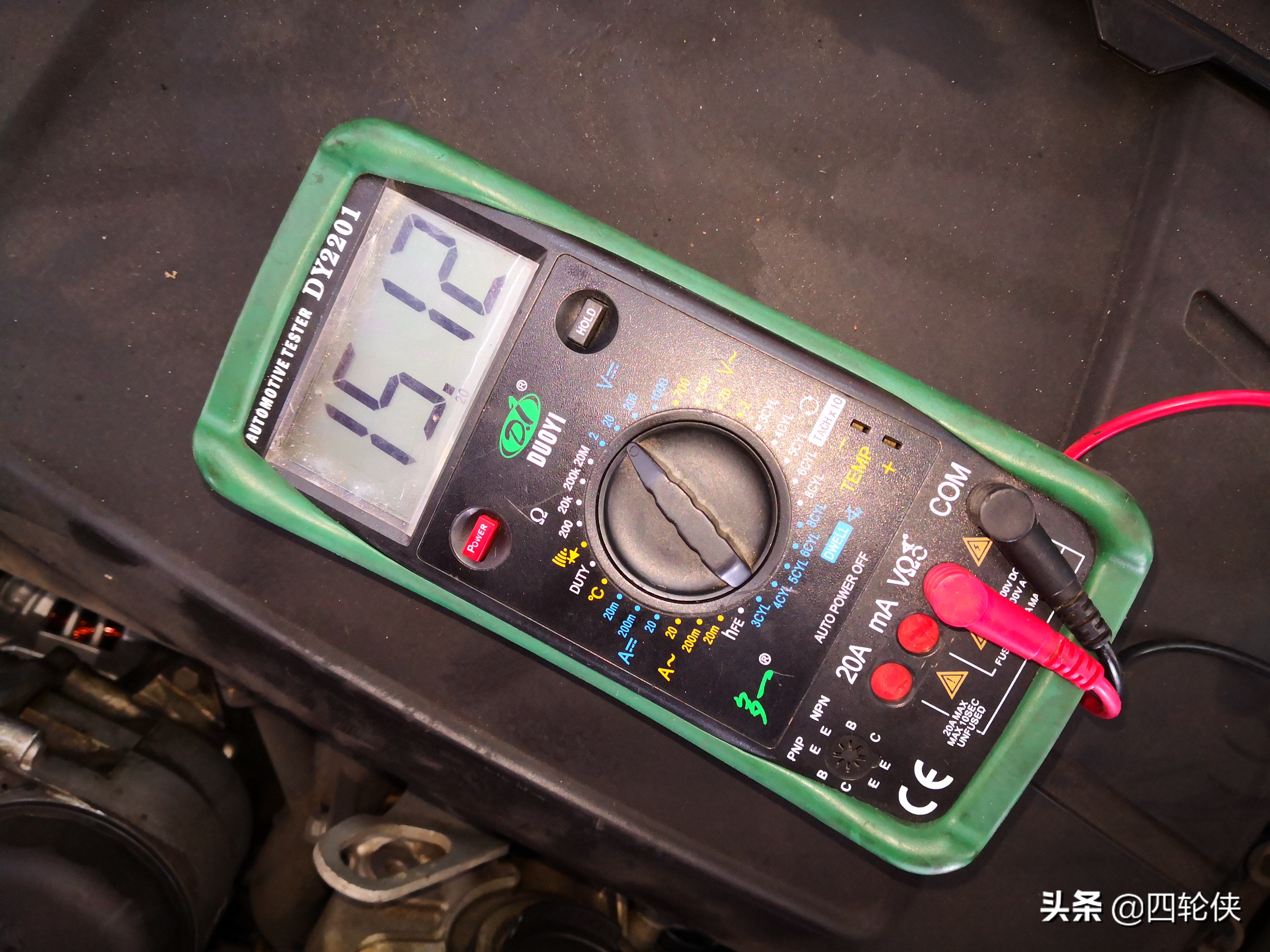 检测了一下电瓶输入电压是15.12伏,稍微高于发电机额定的电压14伏。由于之前电瓶中电量所剩无几,所以开始阶段电压高一些是正常的,以后会降到正常标准。
