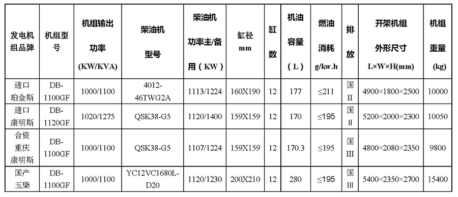 下面列举部分1000kw发电机组的油耗及相关参数: