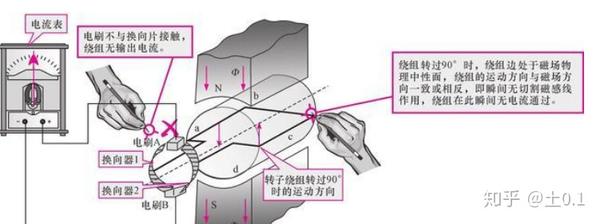 做切割磁感线动作,根据电磁感应原理,绕组内部产生电流,电流的方向由右手定则可判断为:感应电流经线圈dc→cb→ba、换向器1、电刷A、电流表、电刷B、换向器2形成回路。