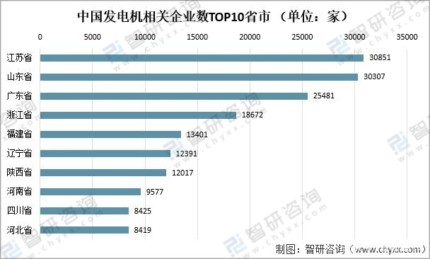 省和河北省。其中,江苏省发电机相关企业最多,已注册企业数为30851家;山东省暂居第二,企业数量为30307家;广东省排行第三,相关企业数量为25481家。